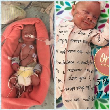 February 16th, 2019. Hope Journee was born weighing 4 lbs 1oz. A week earlier I went into preterm labor for no apparent reason. When we finally realized what was going on we rushed into the birth center and I was already 5cm dilated and her head was at minus 1 station. Somehow they managed to stop my contractions with magnesium and lots of fluids. A catheter/folly was placed because I was put on strict bedrest for a week. That was when the labor started again; 31 weeks 4 days. I got to hold her for maybe 30 seconds and kiss her on the head until they took her away to the NICU. She was a real trooper leaving the hospital in only 3 weeks time, 6 WEEKS before her actual due date. She weighed 5 lbs 3 oz. when we left the hospital and she now weighs 8 lbs 3 oz. She almost already up on the curve for babies her age and I cannot express how proud I am of her.